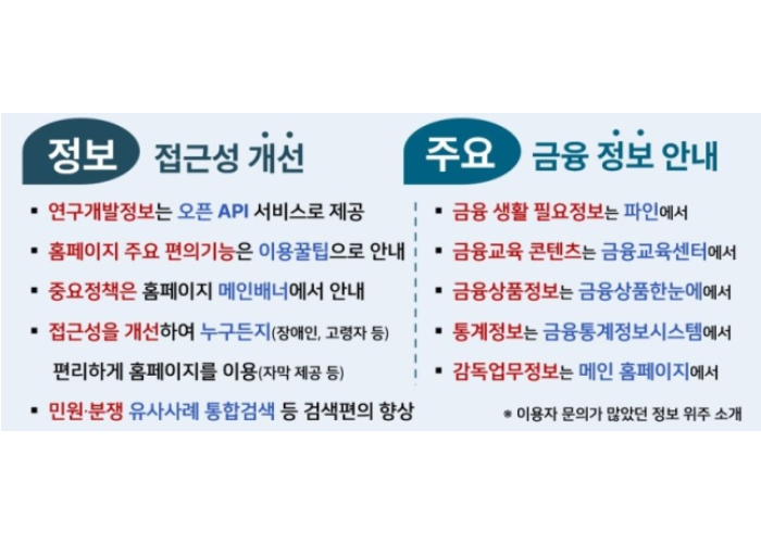 금융소비자 편의성·접근성 개선 금융소비자가 필요한 정보를 한 눈에 찾을 수 있도록 금융감독원 홈페이지가 대폭 개편된다.활용 가치가 높은 금감원 내부 자료를 추가 공개하고 누구나 쉽게 이용할 수 있도록 편의성과 이..