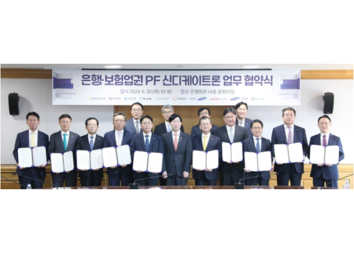 6월20일 오전 은행회관에서 열린 '은행·보험업권 PF 신디케이트론' 업무협약식에서 주요 참석자들이 기념촬영을 하고 있다.(아랫줄 왼쪽부터) 이재근 국민은행장, 이승열 하나은행장, 조병규 우리은행장, 정상혁 신한은행장, 이석용 농협은행장, 김소영 금융위원회 부위원장,여..